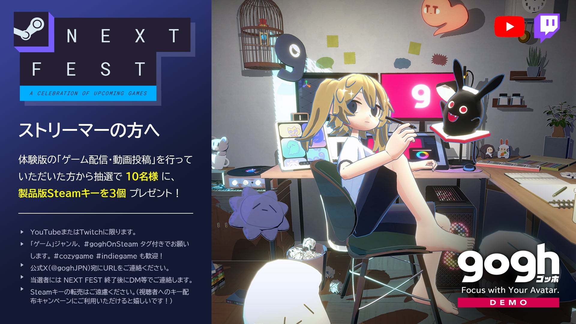 体験版リリースと「Steam Next Fest」への参加を記念して、ゲーム配信者向けに「製品版Steamキー」のプレゼントキャンペーンも行います。gogh体験版のゲーム配信・プレイ動画投稿を行っていただいた方から、抽選で10名様に製品版Steamキーを3つプレゼントいたします。