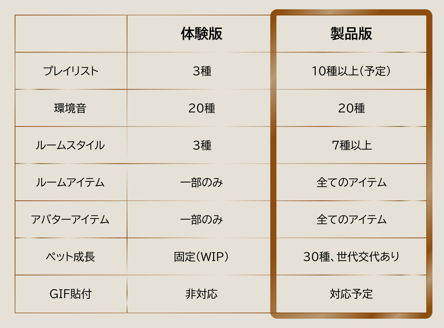 体験版では、開発中の各機能を実際に触っていただくことが可能です。特に、ルーム編集やアバター編集、撮影、タイマーや音楽プレイヤーなどの集中ツールをご利用いただけます。一人でも多くの方に体験版をプレイしていただき、プレイヤーの皆様のご意見・ご要望を今後の開発に反映していきたいと考えております。